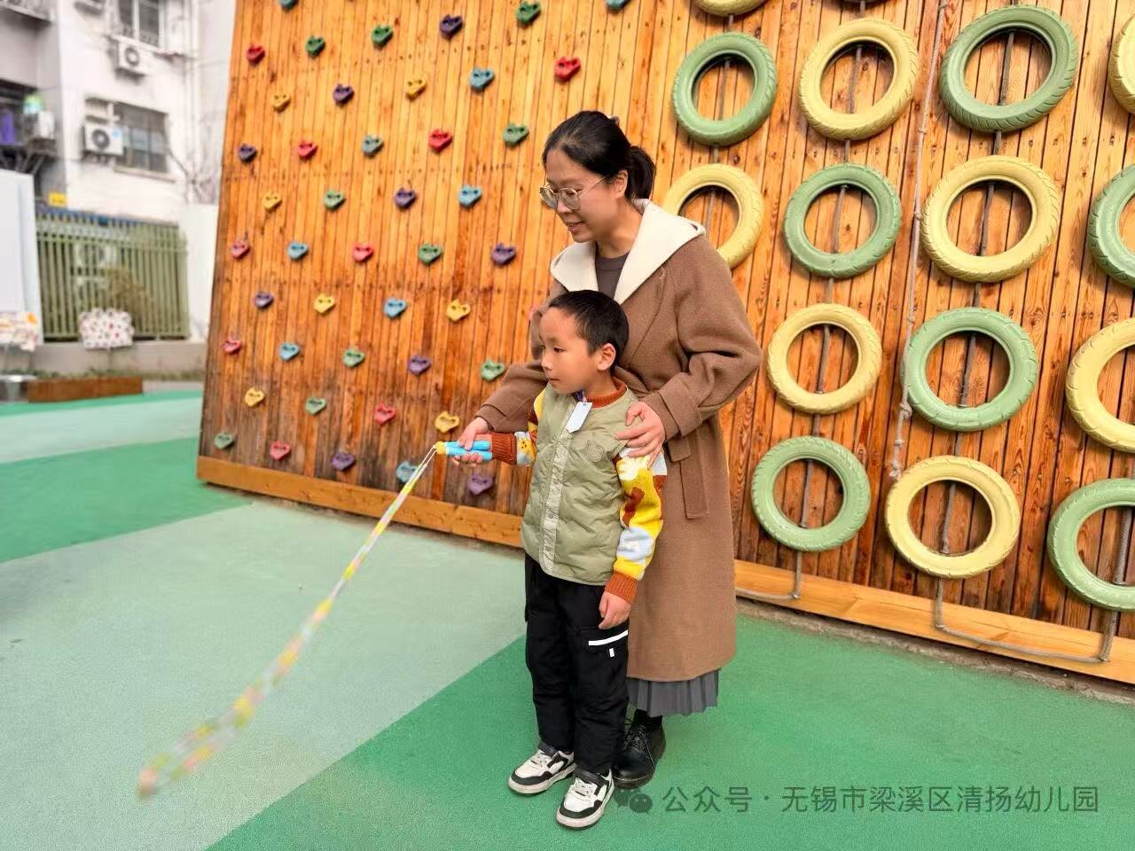 比赛的顺利开展,离不开前期细致入微的准备工作。跳绳比赛都需要准备些什么呢?小运动员们拿起画笔,相互探讨着。孩子们绘制了比赛场地、计时秒表、记分表等工具,当天保健医生也会在场观战,保育员老师提前在班级备好饮用水和纸巾,为孩子们的健康保驾护航。跳绳比赛一下子就变成了孩子们闲暇时光的“讨论焦点”,他们小脑袋凑在一起叽叽喳喳,一起制定并介绍比赛规则!老师们结合《3 — 6岁儿童学习与发展指南》中健康领域的目标,在日常户外活动中融入跳绳技巧指导,从握绳姿势、跳跃节奏,到如何避免绳子绊脚,耐心讲解、示范指导。一根小小的跳绳,见证了大班娃的成长轨迹。还记得初次握绳时的手足无措,跳绳总跟脚步“闹别扭”;而今赛场之上,小身影跃动如精灵,每一次腾空都是成长的勋章,为大班宝贝的蜕变喝彩。有的小朋友甚至解锁了花样跳绳。简单的跳绳在孩子们手中变幻出多样玩法。有的孩子挑战双脚并跳,绳子在脚下“嗖嗖”穿梭;有的尝试单脚跳,灵活切换自如,稳稳当当;还有的小朋友组队完成双人跳,你摇绳我跳跃,配合得十分默契。当然,家长们 也积极配合,带着孩子在家打卡练习,小小的跳绳在家庭与幼儿园之间,架起了一座亲子运动的桥梁。